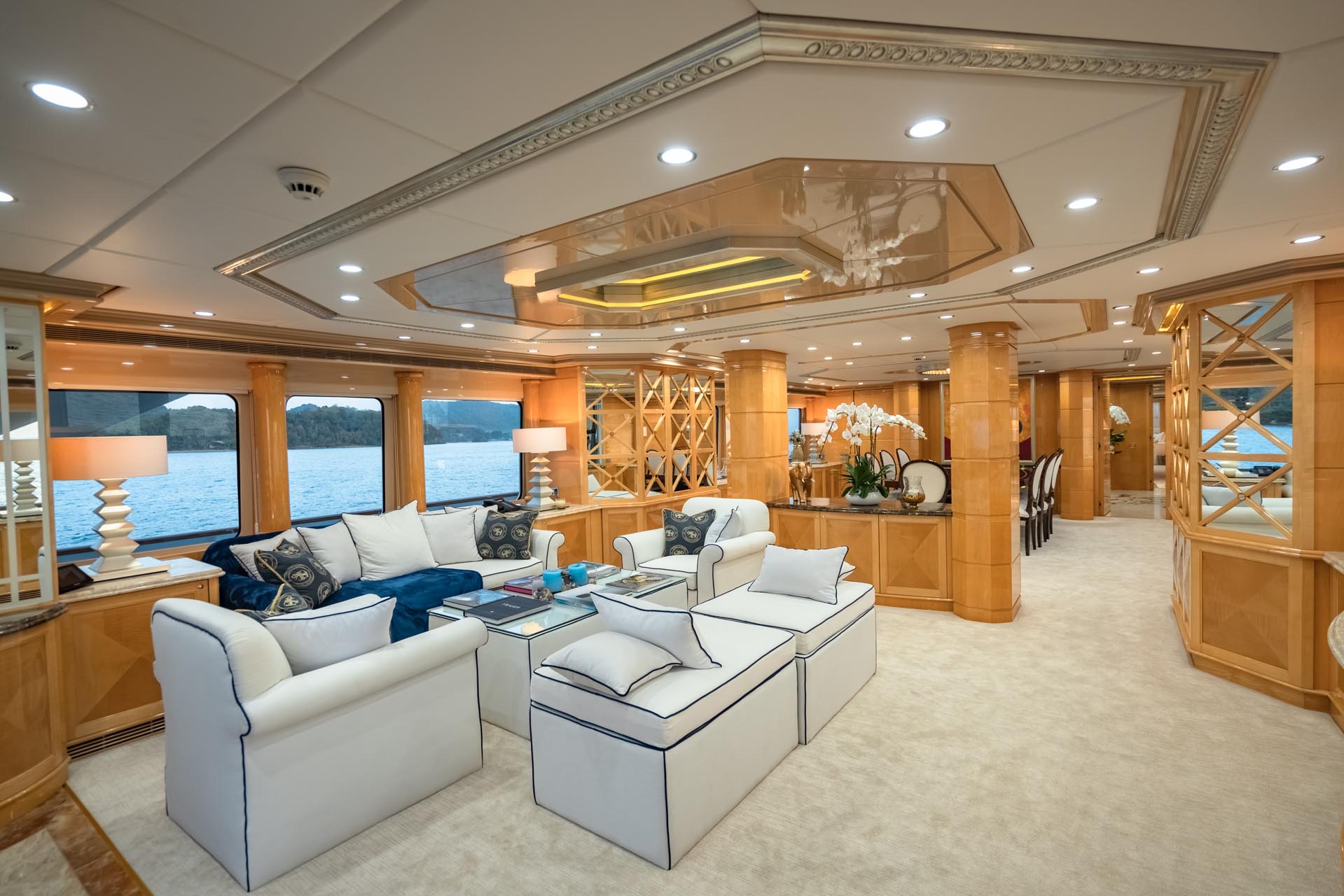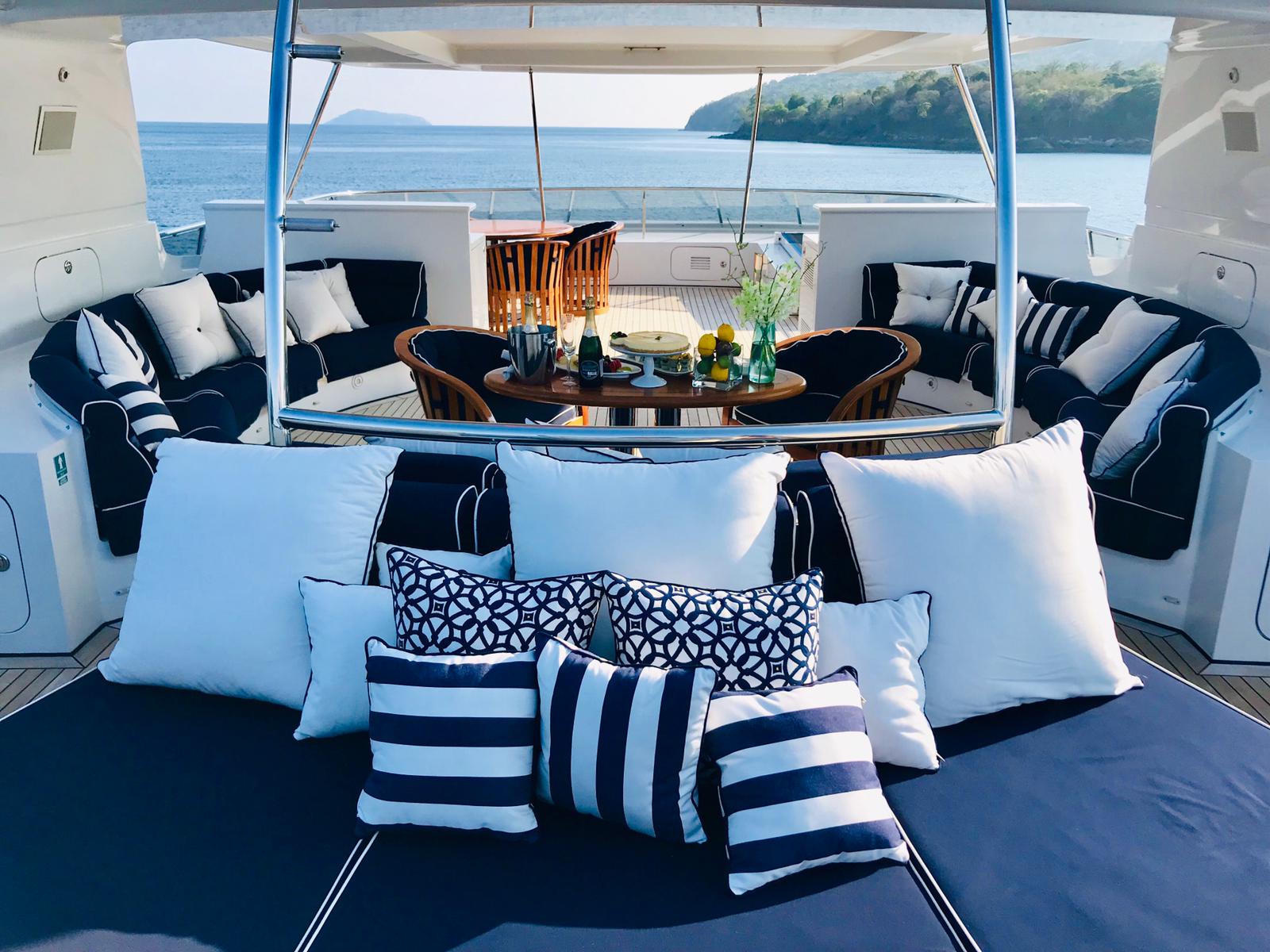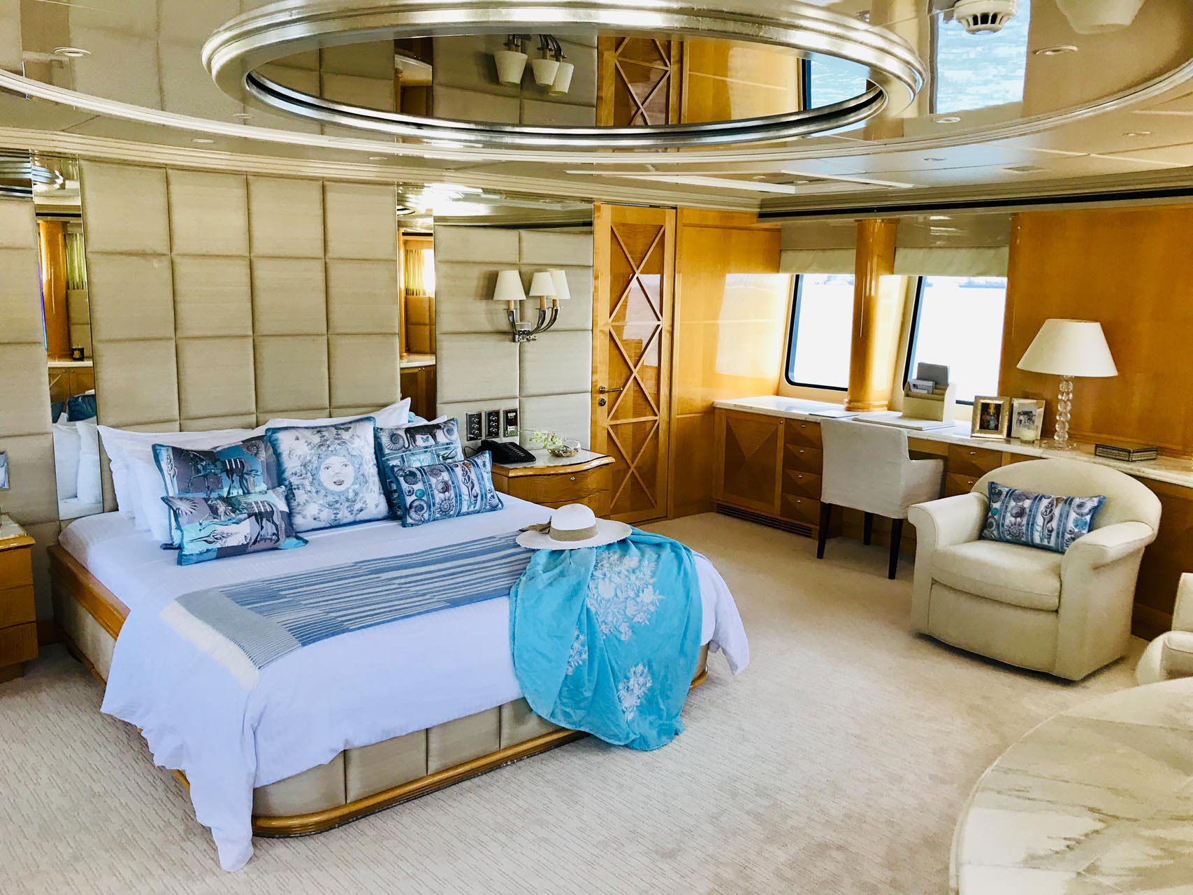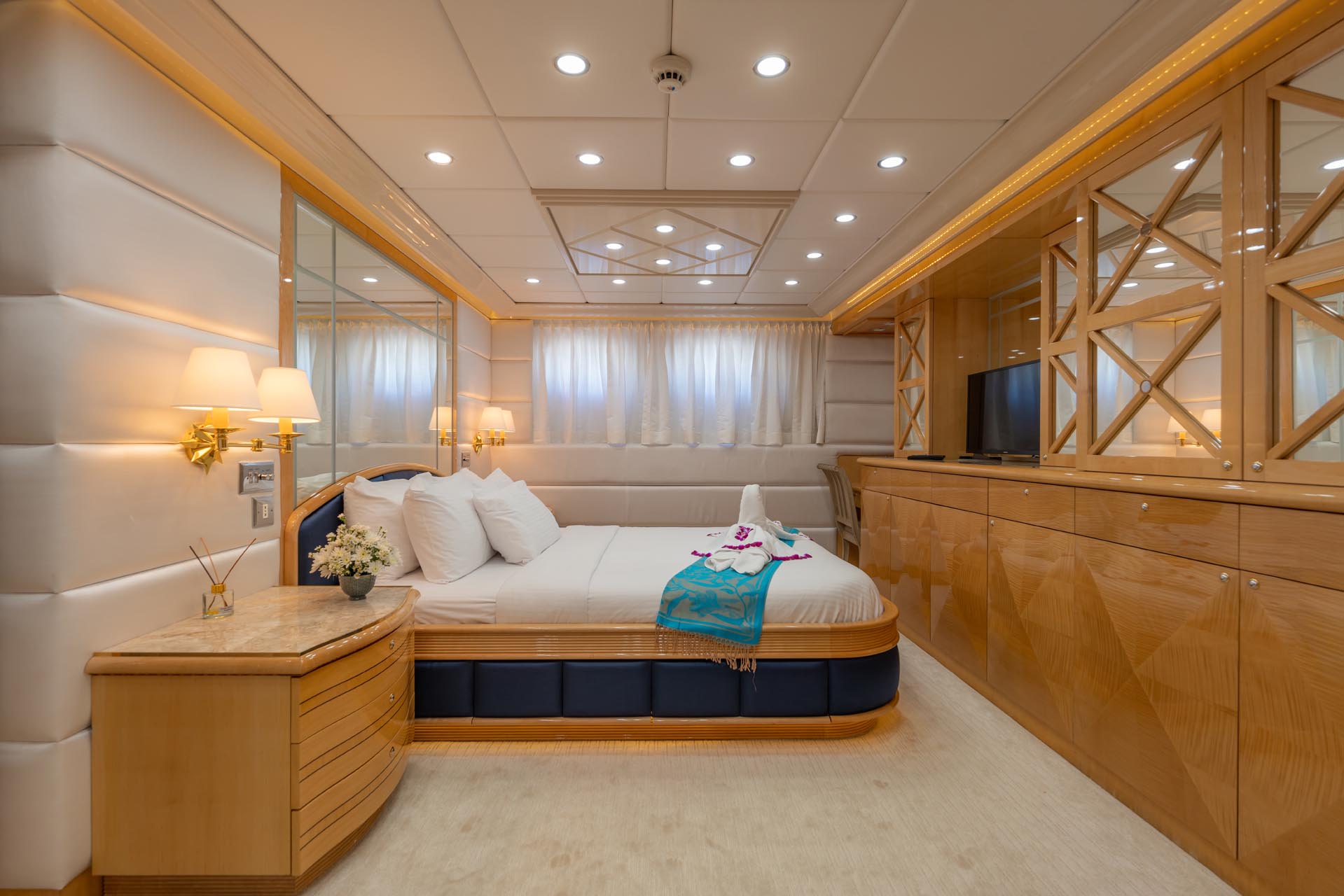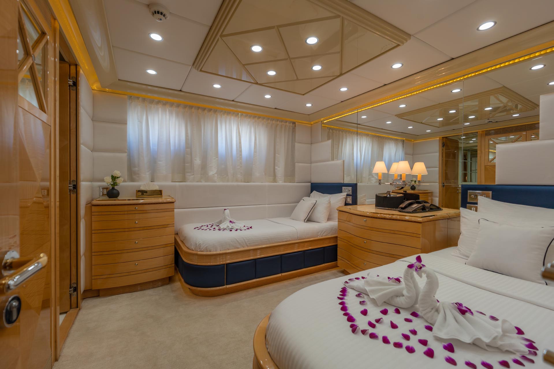 Яхта спроектирована и построена с учетом роскоши и комфорта. На борту 5 кают, состоящих из: главная мастер каюта, расположенная на главной палубе во всю ширину яхты; 2 VIP каюты во всю ширину яхты; 2 Twins каюты на нижней палубе. Все каюты имеют роскошный дизайн, ванные комнаты и кнопки вызова хостесс.